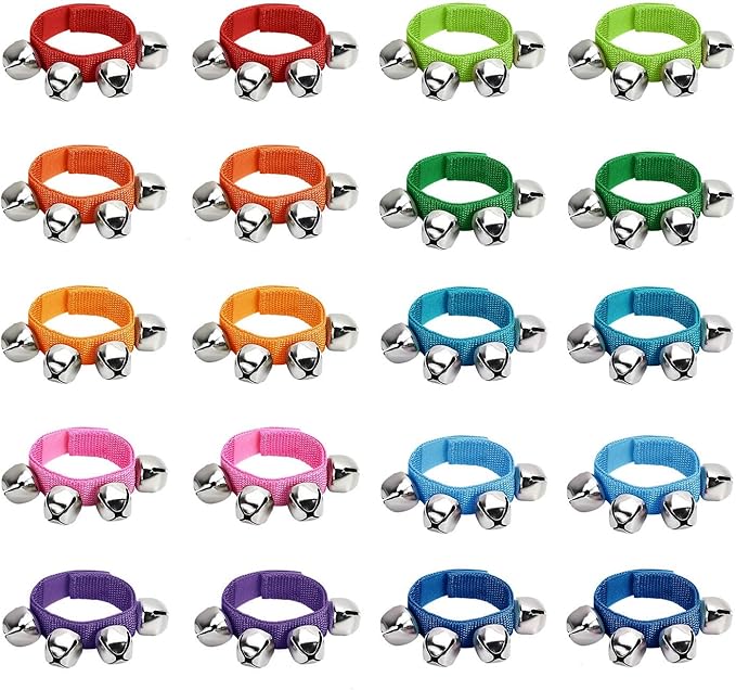 These jingle bells are made of nylon bands and 4 metal bells that create a clear, crisp jingling sound. The 9.5" band length is adjustable with easy-to-use hook-and-loop fasteners, and fits most children's (and many adults) wrists or ankles. Sold as a pair in assorted colors; availability is listed in the drop-down menu.